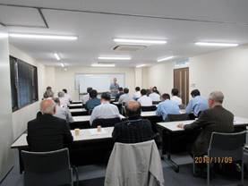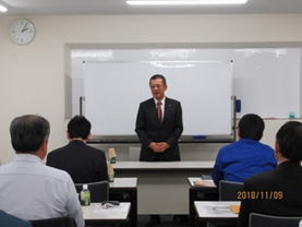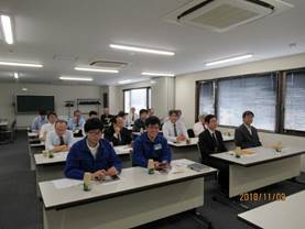 最初に、濵谷社長 様からご挨拶の後、会社概要のご説明をいただきました。当社のような鉄道用電車線機器の総合・専門メーカーは、わが国には関西に1社(当社)と関東に1社の2社しかなく、阪神・淡路大震災の際は、部品の供給を行ってもらい、東日本大震災の際は、当社から部品の供給を行うなど、競合会社ではあるが、相互扶助の関係にあることが話された。