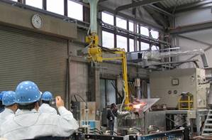 鋳造工場では、鋳造作業において、作業員の負担を減らすために「楽々アーム」というものが採用されていました。これまでは、作業員が、ひしゃくに必要量の金属をくみ取り手作業で注いでいた負担が減ります。機械工場では、製品の曲げ加工において、ハンマーで曲率を一定にする職人技に感心しました。