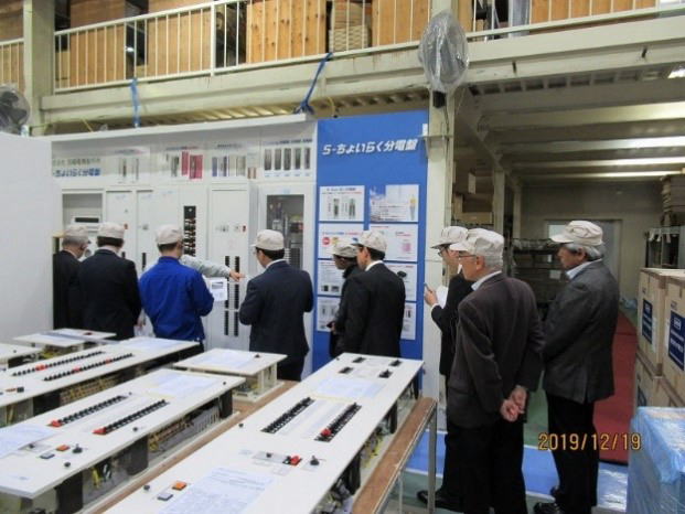 同社は、東西2拠点で全国をカバーされており、電気の配電事業と明かりの照明事業の2事業を展開しています。配電事業部では、発電所で造られた電気を我々の手元に届ける必要不可欠の配電制御システムのキュービクル(配電盤)、分電盤、制御盤について、大きさ、形状等を顧客の要望に応じて作製する特注品(カスタム製品)を製造して納入するとのことでした。