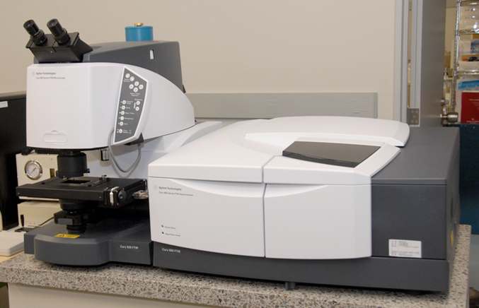 | □イメージング型フーリエ変換赤外分光光度計(FT-IR) プラスチックやゴム、油脂、塗料などの有機物系の試料の素材確認が可能な装置です。試料を変質させることなく迅速に測定できます。また、数10μm程度の微小・微量な試料の測定も可能です。 | ![]() |